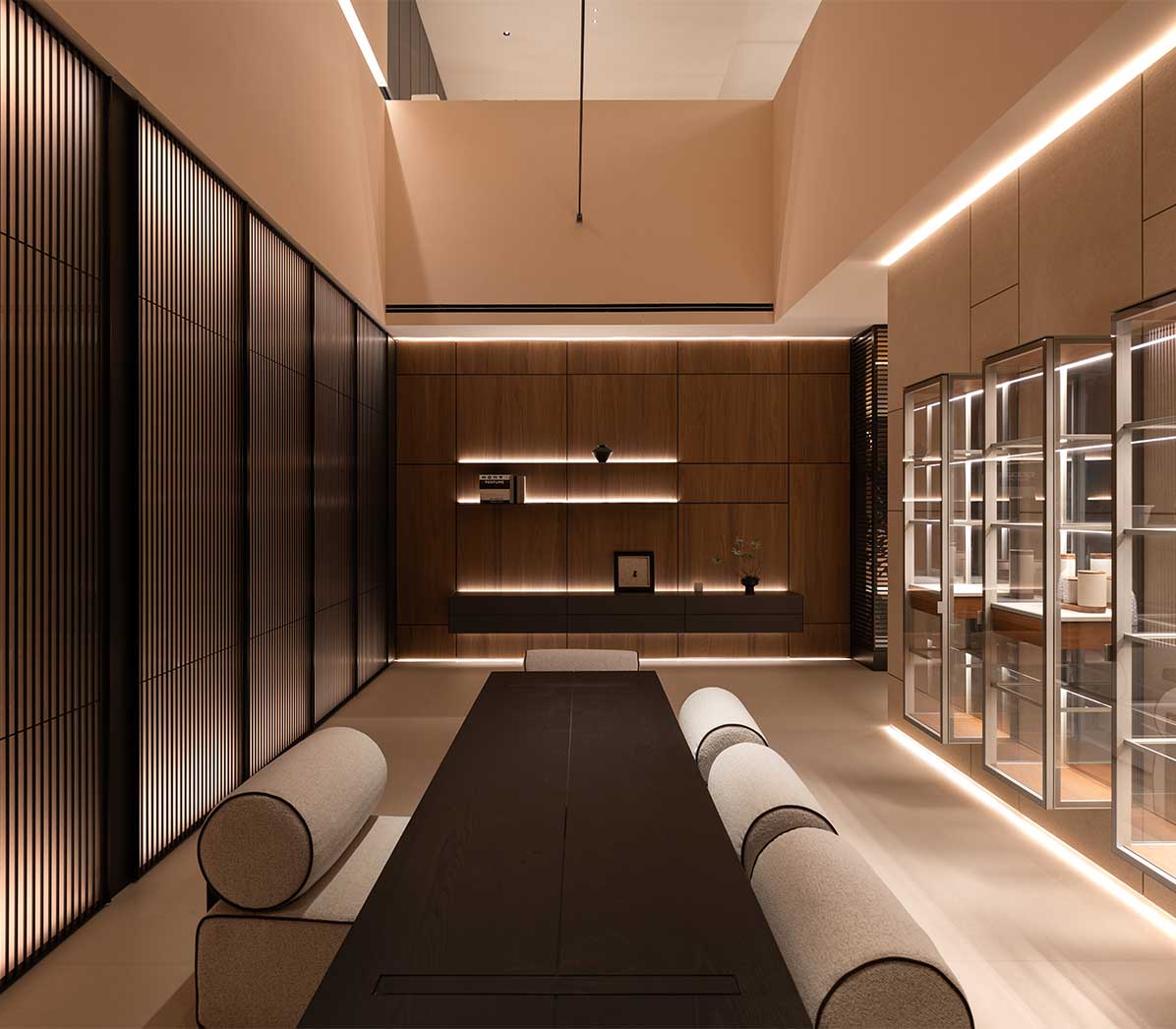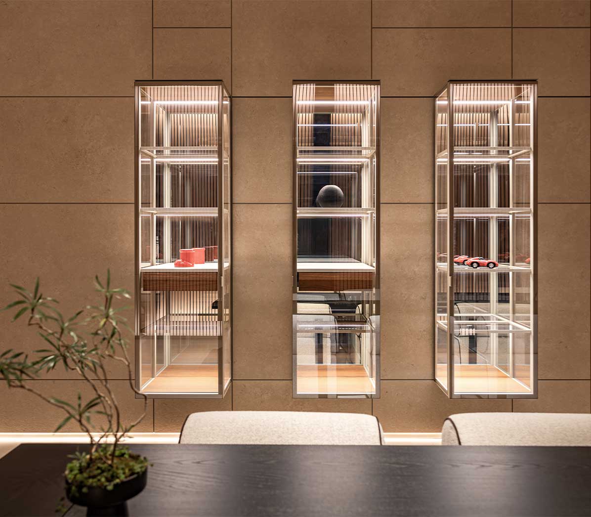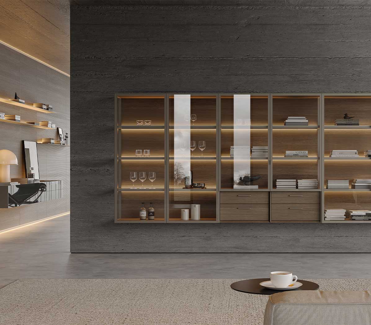 Cabinet Aluminium wood wall system is defined by transparency and order, combining glass doors, lighting, and shelving to create a refined and elegant atmosphere.