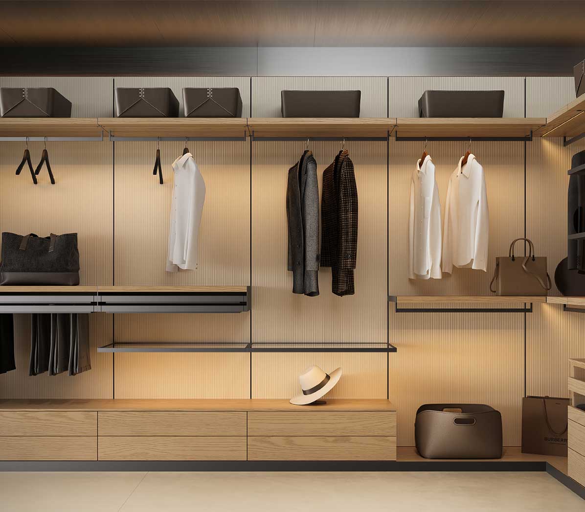 The system balances open display with concealed storage, allowing books, art pieces, and decorative objects to be showcased while maintaining an organized overall appearance. It can also serve as a wine cellar rack, offering multiple design options with full back panels, half back panels, or no back panels.