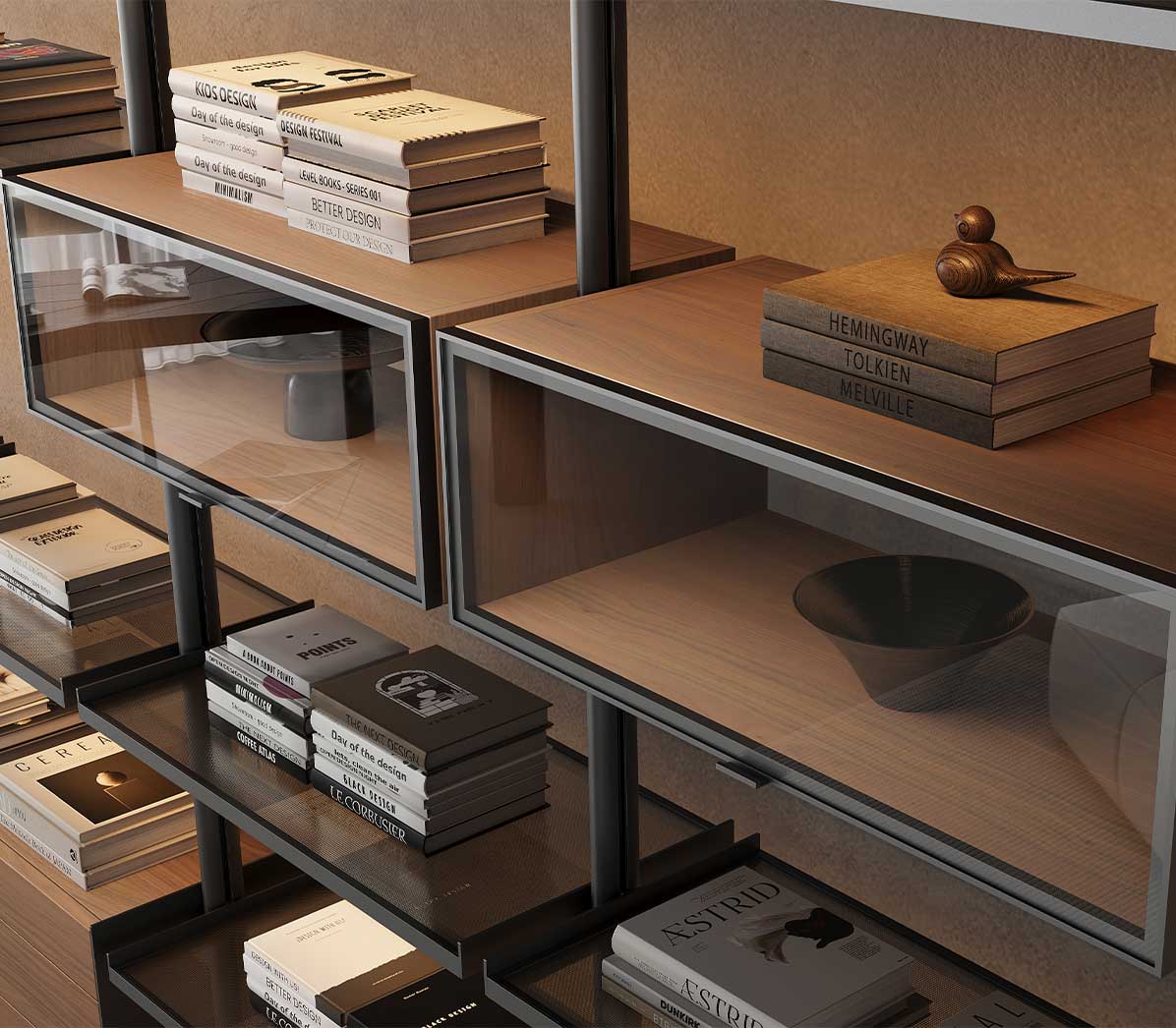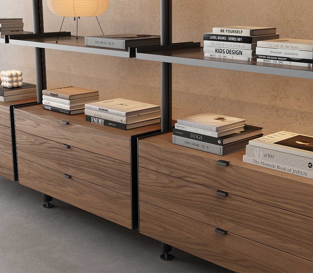 Shelves and storage units can be positioned at the desired height, creating compositions that balance openness with concealed functionality.